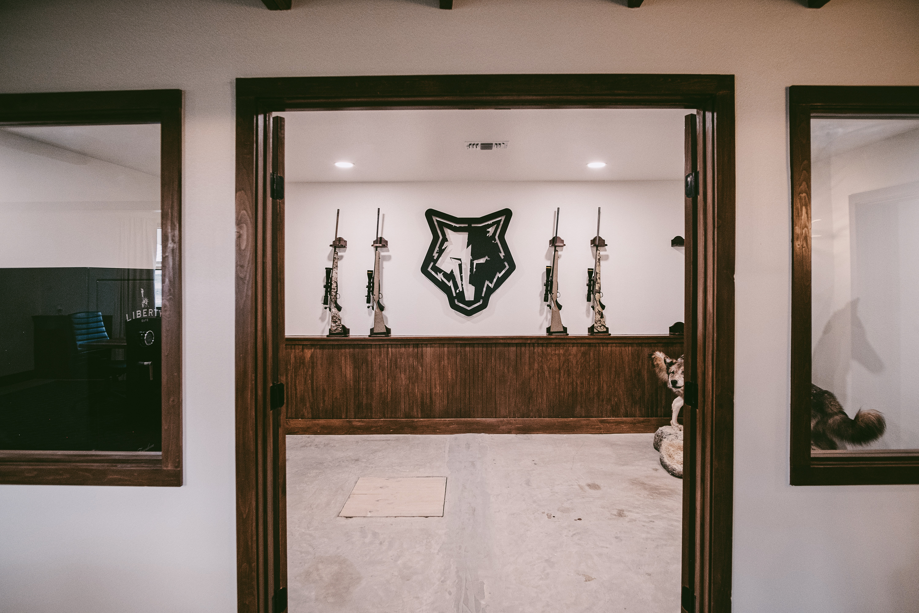 In the Lodge: Against weathered wood paneling and tactical displays, the geometric wolf holds court among rifles and taxidermy, proving that modern design can honor tradition without mimicking it.