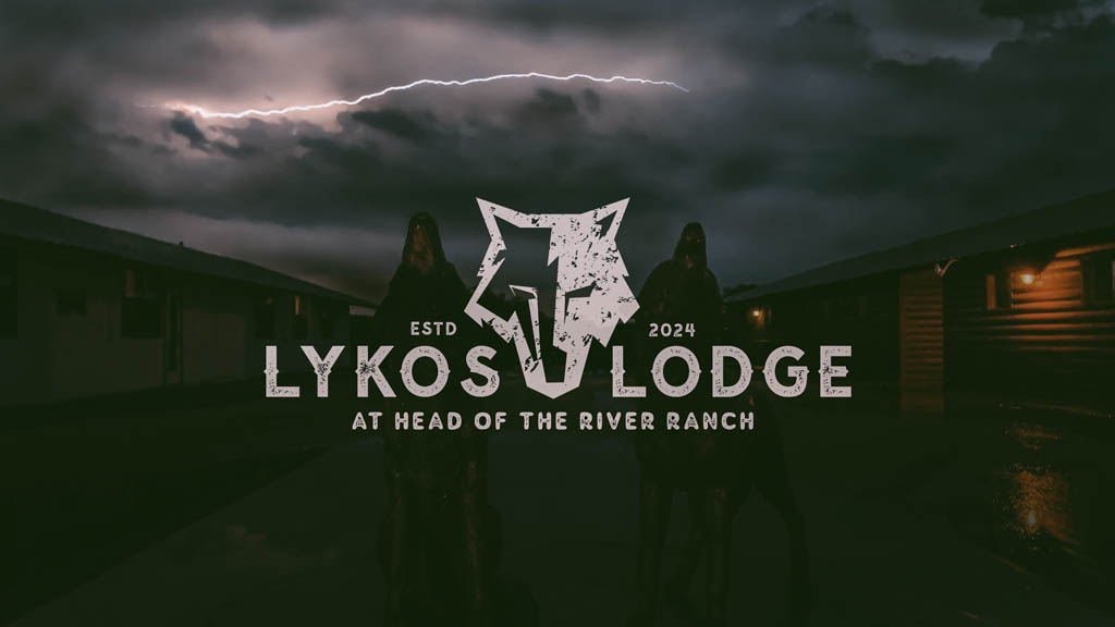 - "LYKOS LODGE" in weathered, sans-serif capitals—institutional without being institutional